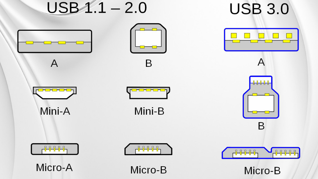 • USB 3.0: Nacieron en 2010. Este estándar transfiere datos a una velocidad de 4,8 Gbps, el doble que los USB 2.0. Los USB 3.0 los podemos diferenciar porque suelen ser azules. También llevan un símbolo de conexión con doble S para identificarlos.