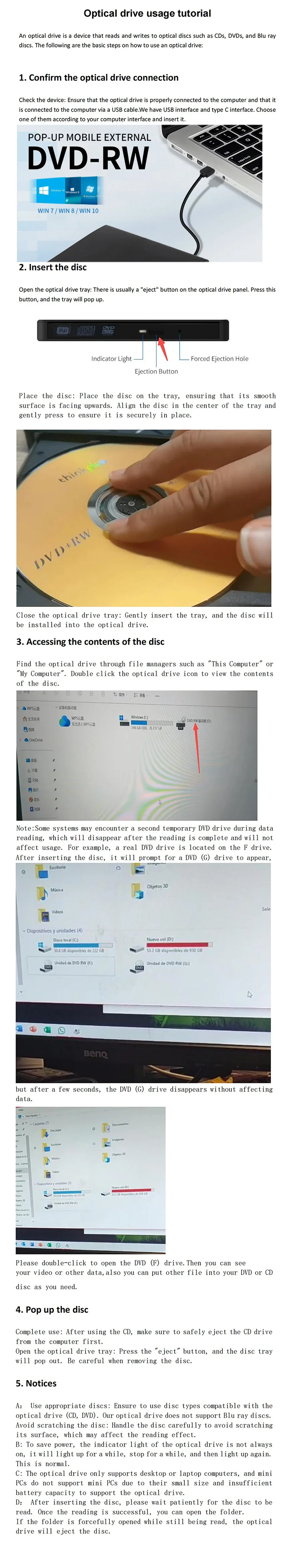 No es sólo un lector, sino también un escritor/quemador.Puede usarlo para reproducir DVD de su película, disfrutar de CD de música, grabar/retencer discos, instalar software/sistema, descargar juegos y más.