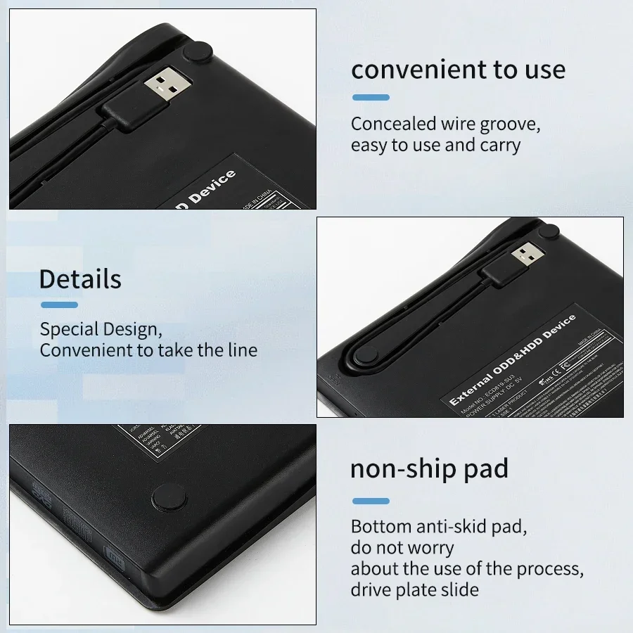 La caja de unidad óptica móvil externa es adecuada para computadoras de escritorio y portátiles con protocolo de interfaz USB2.0 o 3.0.Realiza la función de leer información entre la unidad óptica externa y la computadora a través de la interfaz USB.